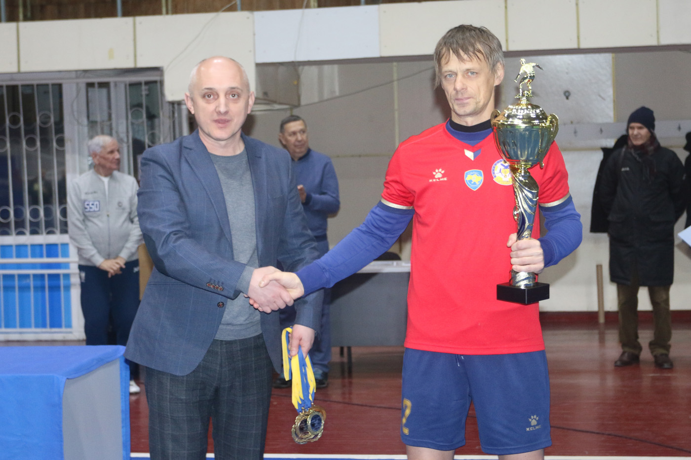 І ось, довгоочікувана головна нагорода… Команда «Кудрівка-Veterans» цього року створила справжній фурор в ветеранському футболі, зробивши «золотий» хет-трик! Спершу перемогла в чемпіонаті України 45+, згодом в чемпіонаті України 35+ і, нарешті, в Різдвяному турнірі пам’яті. Головний трофей із рук Олега Собуцького отримав капітан Валентин Васильєв!