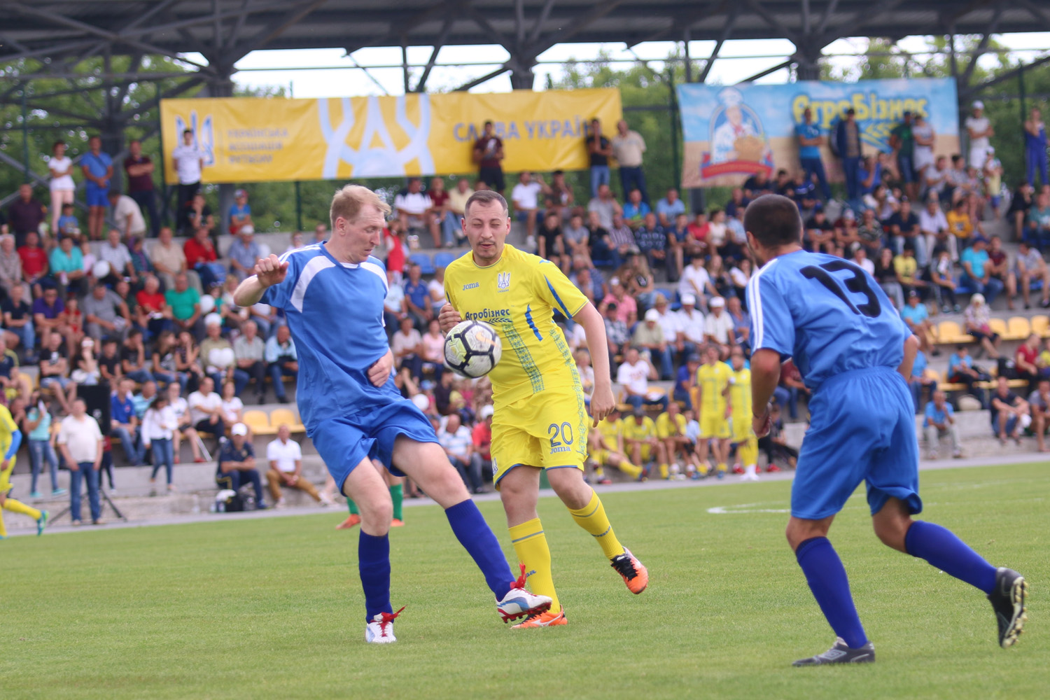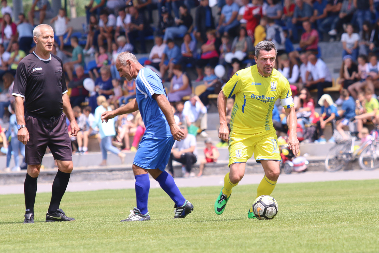 Цікаво, що арбітром зустрічі виступив Микола Шершун, батько відомого гравця Богдана Шершуна. Був добрий привід пошуткувати щодо «конфлікту інтересів», особливо в моментах, коли знаний екс-захисник збірної України непоступливо діяв з опонентами. Щодо матчу, вже в дебюті Володимир Бондаренко рахунок відкрив, згодом Олег Собуцький перевагу подвоїв. Звітний м’яч став 80-м для засновника збірної ветеранів за три з половиною років її існування, із чим ювіляр та найкращий бомбардир отримав щирі вітання від партнерів! Після перерви Андрій Хомин потроїв перевагу, натомість господарі відповіли влучним ударом після швидкого проходу Андрія Балицького. У підсумку, з рахунком 3:1 перемогли легенди футболу!