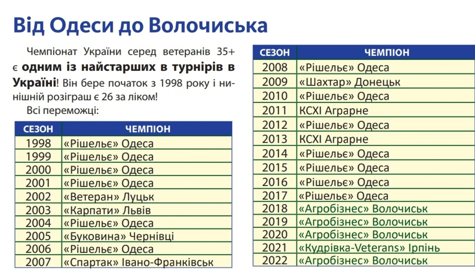 Чемпіонат України серед ветеранів 35+ є одним із найстарших турнірів в Україні! Він бере початок з 1998 року і нинішній розіграш є 26 за ліком!
