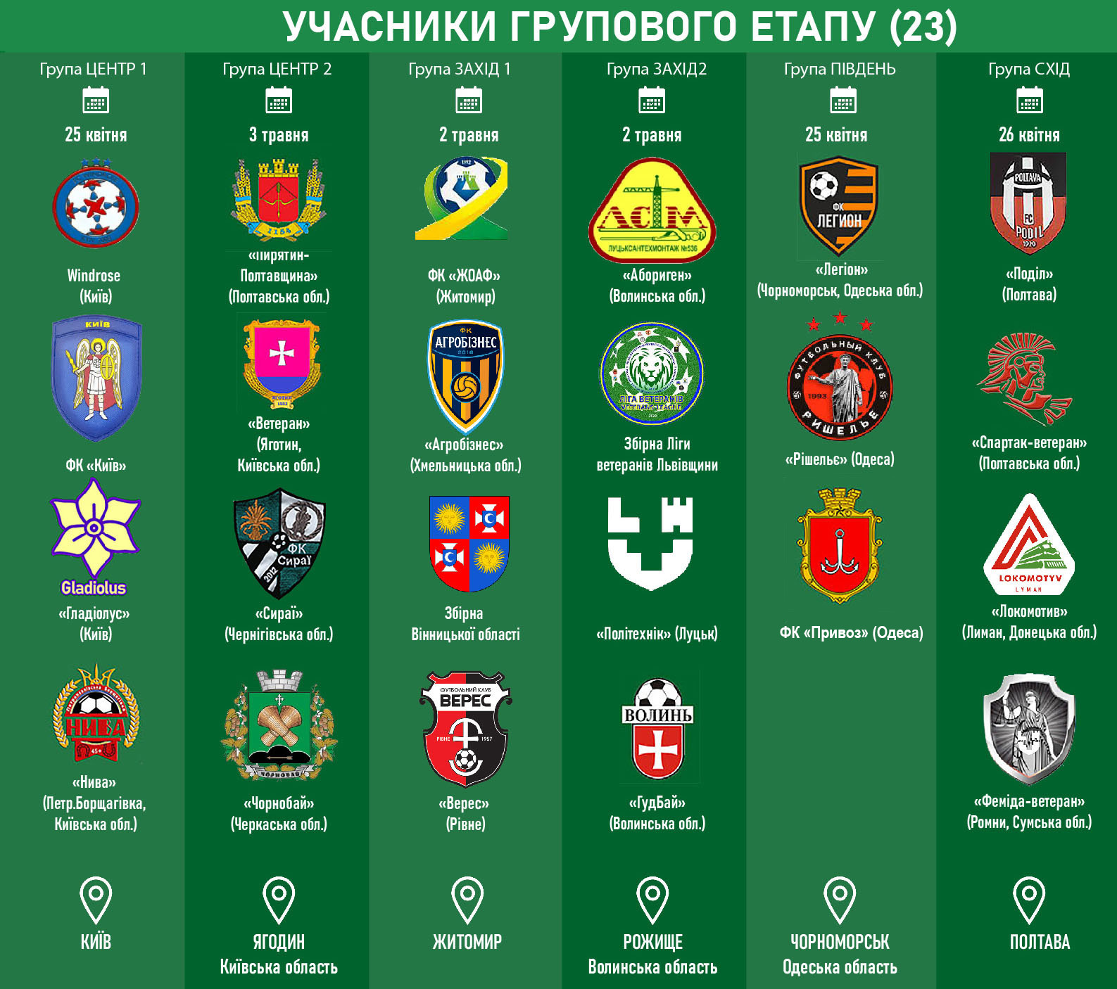 Учасники: «Пирятин-Полтавщина» (Полтавська обл.), «Ветеран» (Яготин, Київська обл.), «Сираї» (Чернігівська обл.), «Чорнобай» (Черкаська обл.). Матчі групи відбудуться 3 травня в Яготині (Київська обл.)