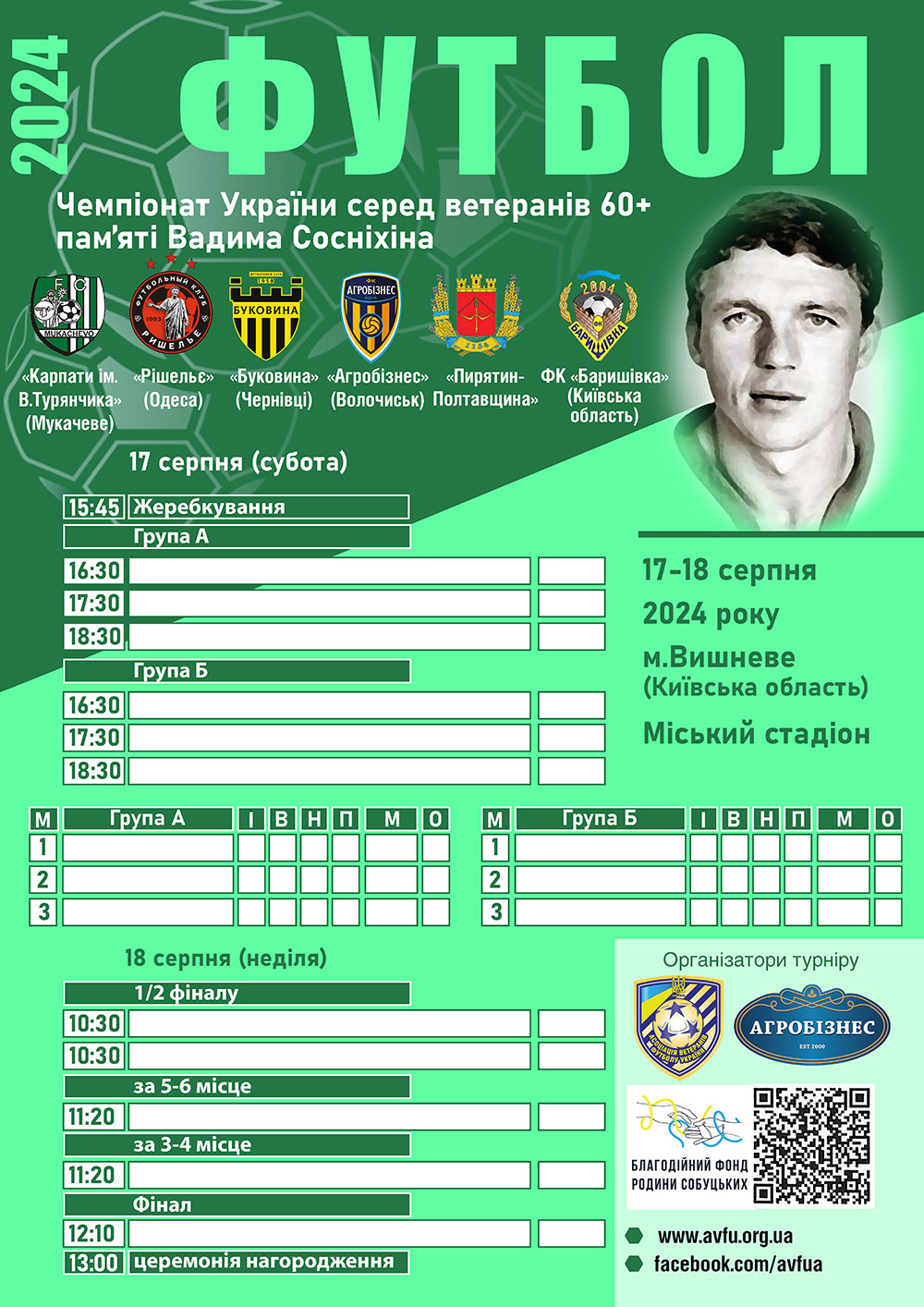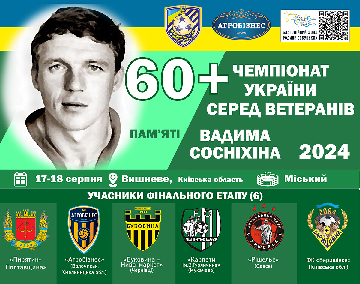 17-18 серпня у місті Вишневе (Київська область) на Міському стадіоні відбудеться фінальний етап чемпіонату України серед ветеранів 60+, присвяченого пам’яті видатного футболіста та тренера Вадима Сосніхіна.