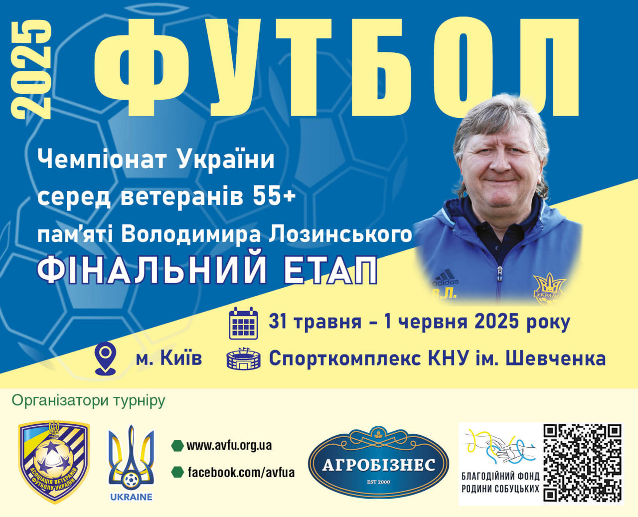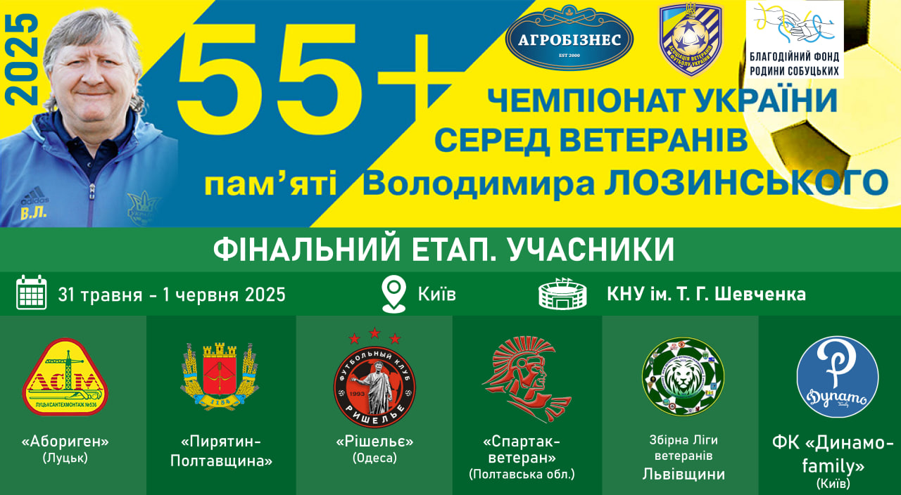 31 травня – 1 червня 2025 року у місті Києві на стадіоні КНУ ім.Тараса Шевченка відбудеться фінальний етап чемпіонату України серед ветеранів 55+, присвяченого пам’яті видатного футболіста та тренера Володимира Лозинського.
