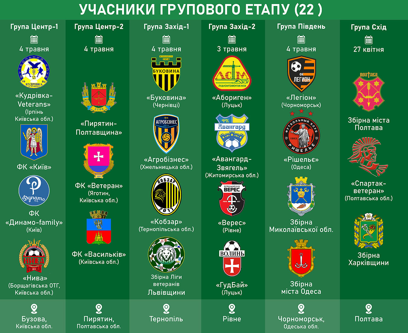 Учасники:«Кудрівка-Veterans» (Ірпінь, Київська обл.), ФК «Київ», «Динамо Family» (Київ), «Нива» (Петропавлівська Борщагівка, Київська обл.). Матчі відбудуться 4 травня у Бузовій, Київська область.