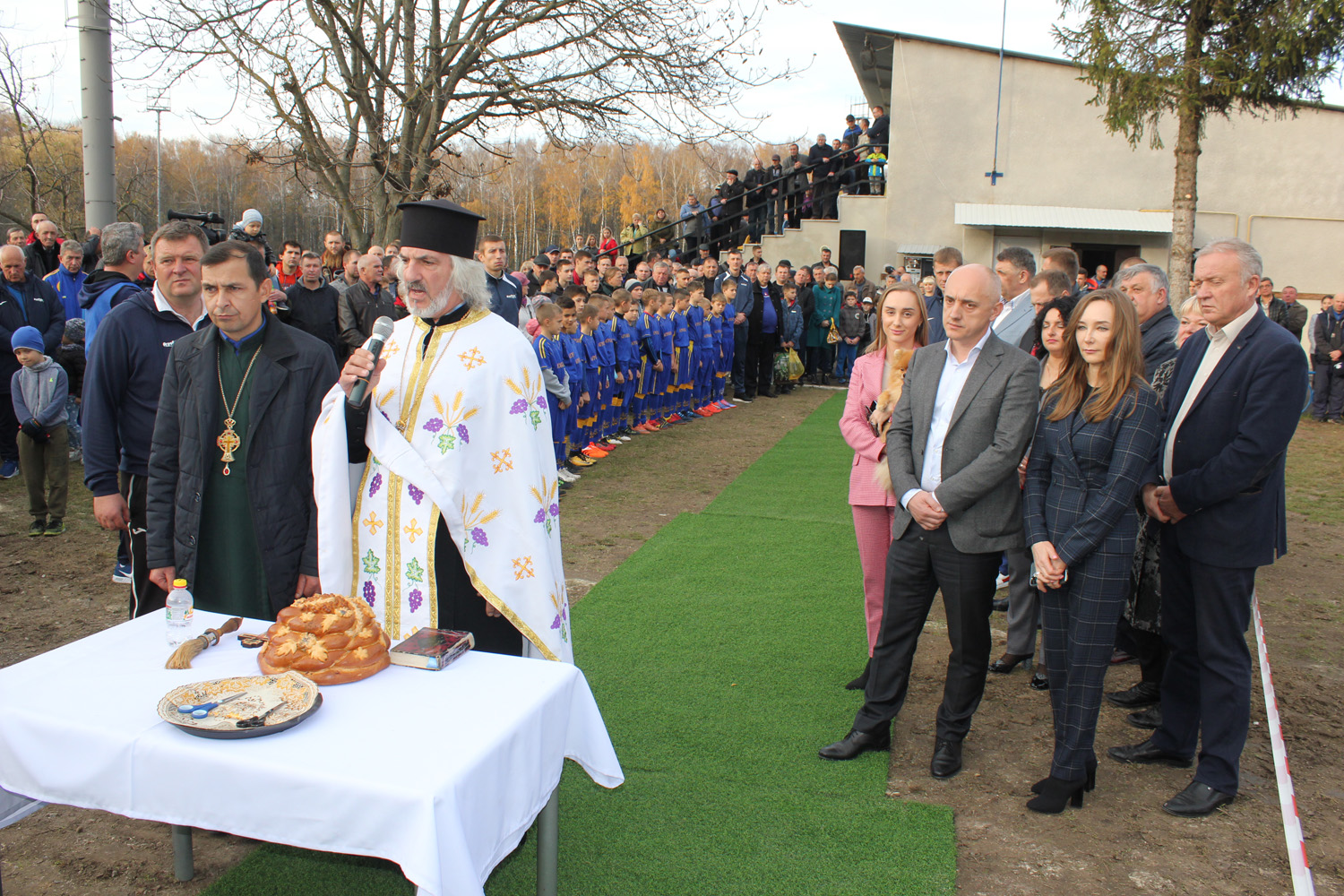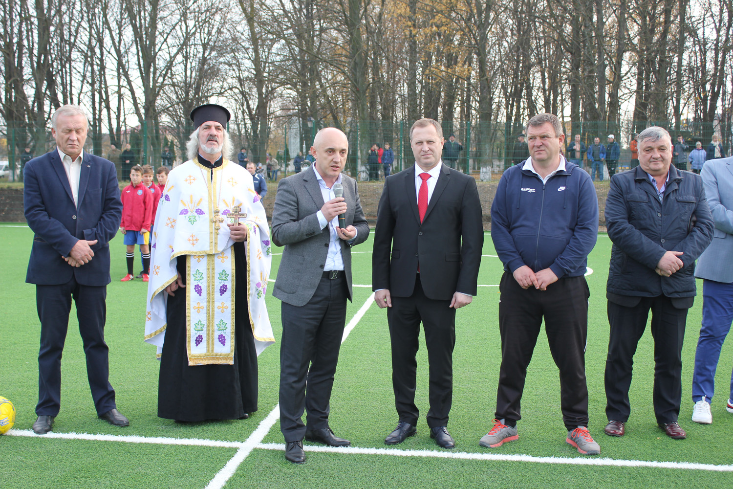Символічну стрічку перерізали почесний президент ФК «Агробізнес» Олег Собуцький та перший заступник міського голови Волочиська Олександр Васильченко. Гостями урочистої церемонії разом із сотнями містян стали голова Тернопільської ОДА Ігор Сопель, голови Хмельницької та Чернівецької обласних федерацій футболу Ігор Хіблін та Василь Орлецький відповідно, знаменитий футболіст Сергій Нагорняк, голова Хмельницької обласної спілки ветеранів АТО Сергій Чиж та багато інших почесних людей. Передувала відкриттю молитва, зачитана отцем Миколою Фатичем.