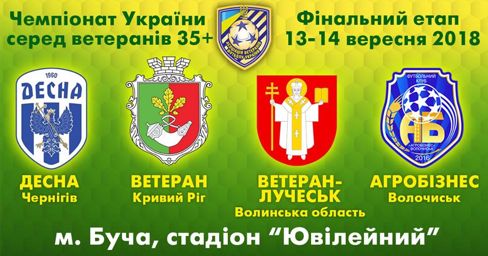 Нинішня осінь буде багата на події у ветеранському футболі України! Першими, згідно розкладу змагань Асоціації ветеранів футболу України, стартують наймолодші, визначивши найсильнішого у чемпіонаті України в віковій категорії 35 років і старше. Фінальний етап відбудеться 13-14 вересня 2018 році у місті Буча (Київська область) на стадіоні «Ювілейний».